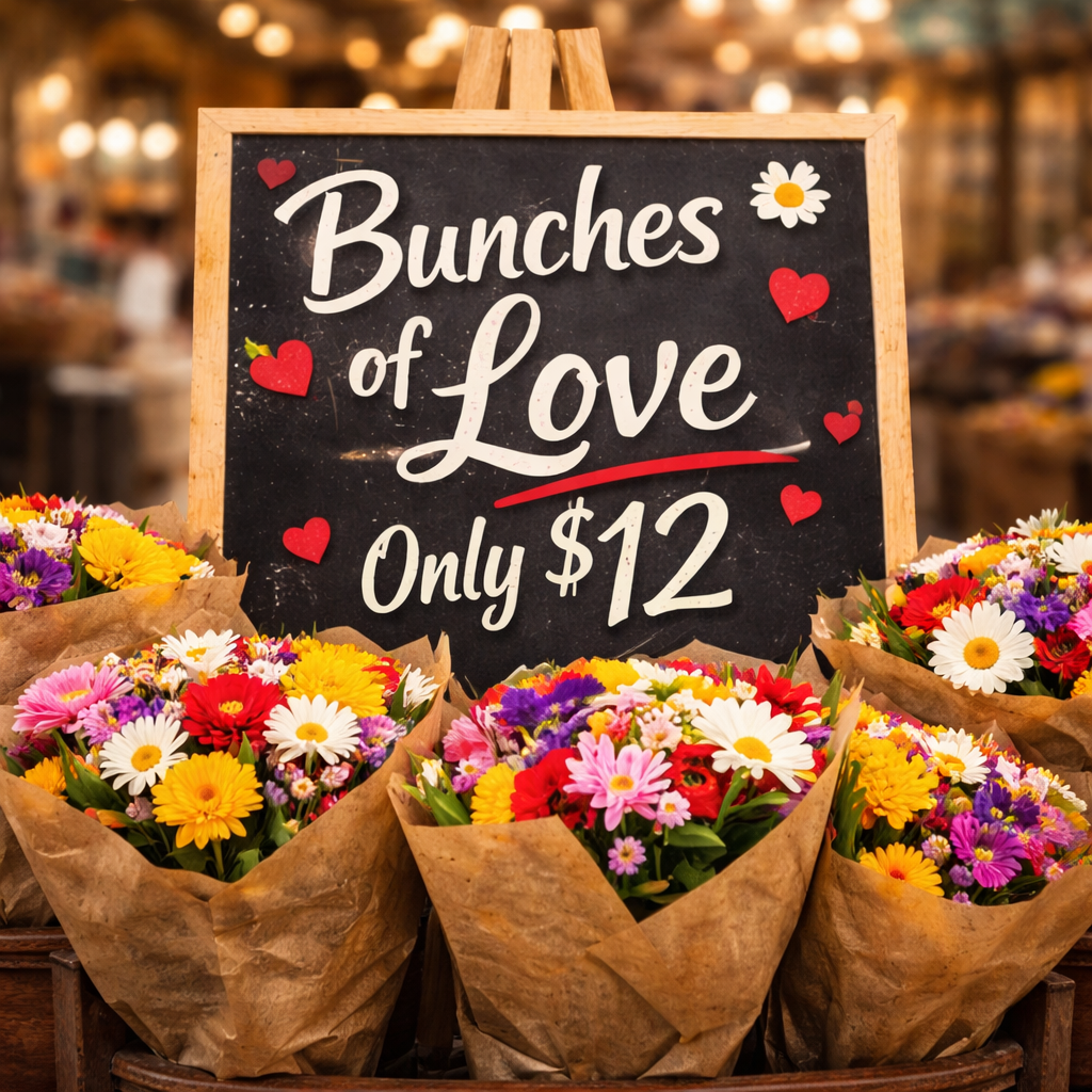 I asked her to humour me and give it a try. I also gave her $50 to get the sign made. Then, I asked for her business card so I could call her in one month to find out how her ‘Bunches of Love’ were selling.