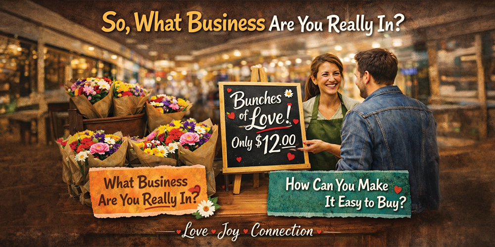 I asked her what business she’s in. She looked at me as if I had two heads and said, “I sell flowers. Can’t you see that?” “Yes, you do.” I replied, “But that’s not what business you’re in. You’re in the ‘love’ business; the business of helping people express caring, joy, sorrow, support or celebration…and all of that is love. And you’re in the business of making it easy for people to buy. So, what those flowers need is a sign that says, Bunches of love…only $12.00 and I bet you’ll sell out every day!”